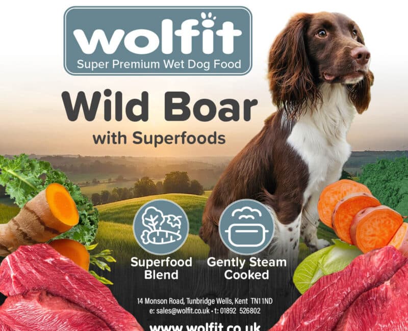 60% Wild Boar, 29.8% Broth, Vegetables (5% Sweet Potato, 3% Kale, 1% Chicory), Minerals, Vegetable by-products (0,1% Curcuma), Algae (0,1% Spirulina)